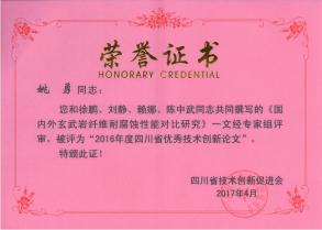 本次研讨会特别表彰了一批2016年度四川省优秀管理、优秀技术创新论文,其中:由公司姚勇、徐鹏、陈中武等人撰写的《国内外玄武岩纤维耐腐蚀性能对比研究》论文获得了“2016年度四川省优秀技术创新论文”表彰。