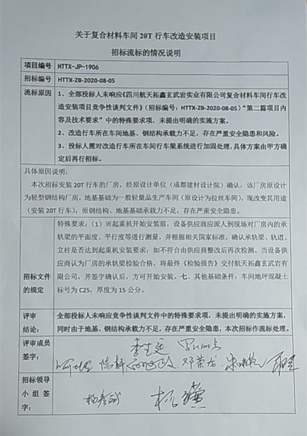 关于复合材料车间20T行车改造安装项目招标流标的说明