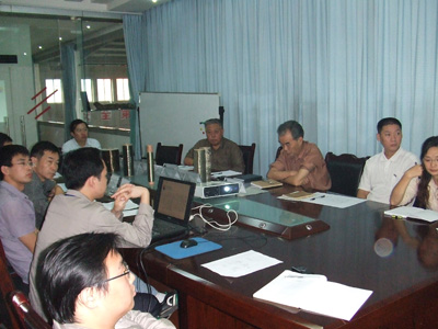 图片为公司领导、各部门讨论4-9月份经营目标计划完成情况照片