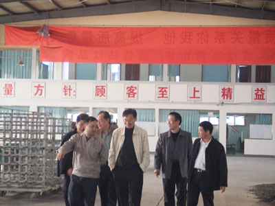 图为我公司副总杨彦斌(左一)陪同省经信委建材处处长闫克俭(左二)、副处长刘道君(左四)等领导参观公司生产车间现场
