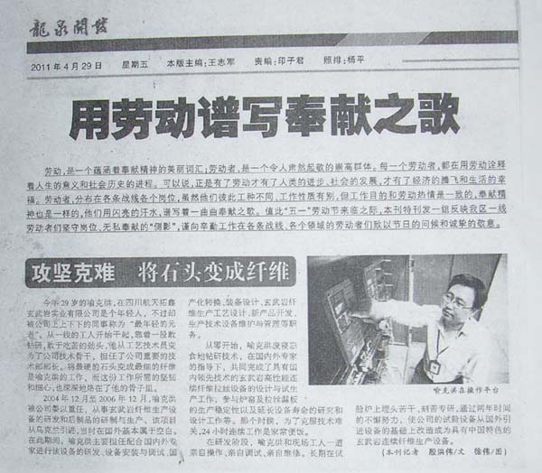 我公司技术部部长喻克洪因业务能力出众,具备航天人“特别能吃苦,特别能战斗”的优良品质,被龙泉开发报评为2011年度“五一”劳动宣传榜样,并将喻部长先进事迹报道在2011年4月29日进行专版宣传。