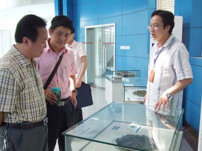 公司副总经理鲜平(右一)陪同市科协卢晓东副主席(左一)参观公司玄武岩制品展示厅