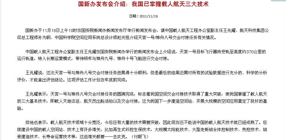 国新办发布会介绍:我国已掌握载人航天三大技术