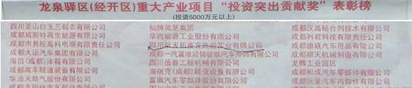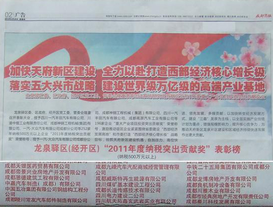 2012年3月29日,成都商报发表题为“加快天府新区建设 全力以赴打造西部经济核心增长极 落实五大兴市战略 建设世界级万亿级的高端产业基地”文章,龙泉驿区委、区政府、经开区党工委、管委会隆重表彰252家纳税突出贡献企业和196家重大产业化项目投资突出贡献企业,我公司分别获得纳税突出贡献企业和重大产业化项目投资突出贡献企业荣誉。
