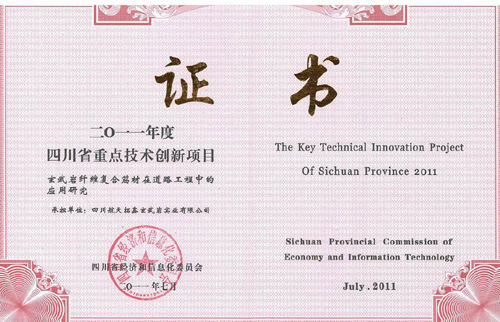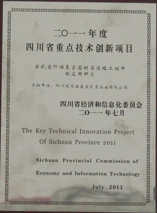 四川航天拓鑫玄武岩实业有限公司承担的《玄武岩纤维复合筋材在道路工程中的应用研究》项目被四川省经济和信息化委员会列入2011年度四川省重点技术创新项目。