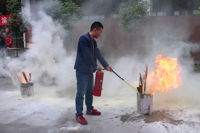 使用前要将瓶体颠倒几次,使筒内干粉松动,然后除掉铅封,拔掉保险销,左手握着喷管,右手提着压把,在距火焰两米的地方,右手用力压下压把,左手拿着喷管左右摇摆,喷射干粉覆盖燃烧区,直至把火全部扑灭。