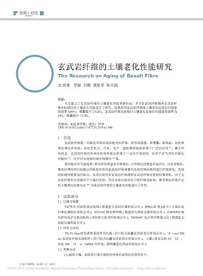 我公司撰写题为《玄武岩纤维的土壤老化性能研究》的文章被发表在国家级《中国纤检》2015年三月刊中,文章详细建立了玄武岩纤维的土壤老化性能考察办法,并对玄武岩纤维绳和玄武岩纤维无捻粗纱的土壤老化性能进行了研究。结果表明玄武岩纤维绳土壤老化处理后的强度保留率为80%,模量提升了4.2%;玄武岩纤维无捻粗纱土壤老化处理后的强度保留率为82%,模量提升了3.5%。