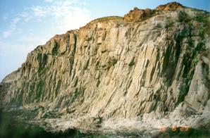 玄武岩是由火山喷发出的岩浆冷却后凝固而成的一种致密状或泡沫状结构的岩石。它在地质学的岩石分类中,属于岩浆岩(也叫火成岩)。岩浆岩分侵入岩和喷出岩两种。其中侵入岩是地下岩浆在内力作用下侵入地壳上部,岩层冷却凝固而形成岩石,它的矿物结晶颗粒较大,代表岩石有花岗岩。喷出岩是地下岩浆在内力作用下,沿地壳薄弱地带喷出地表冷凝而形成岩石,它的矿物结晶颗粒细小,有的有流纹或气孔构造,代表岩石就是玄武岩。火山爆发流出的岩浆温度高达摄氏一千二百度,因有一定的粘度,在地势平缓时,岩浆流动很慢,每分钟只流动几米远;遇到陡坡时,速度便大大加快。它在流动过程中,携带着大量水蒸汽和气泡,冷却后,便形成了各种变异的形状。