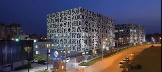 Abin 设计工作室的设计师Abin Chaudhuri为印度加尔各答纽顿小学建立了独特的地标,从远处看,每个外立面看起来就像一个复杂的具有字母和数学符号的鲁比克魔方® (Rubik’s Cube®)。这些字母和符号为外立面创造了一种定制模板。这些结构能够为孩子们带来一种图形化但又有趣的美学体验。