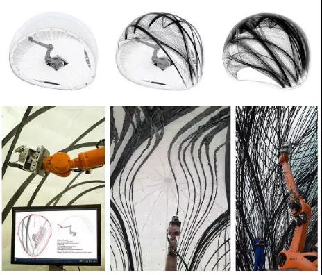 该技术涉及到用机械臂缠绕复合材料——旨在利用碳纤维的材料特性赋予像制造结构部件一样的强度。一系列这些单个细胞样的模块用来建造长亭独特的形状。这40个单元平均每个需要3小时来制造。